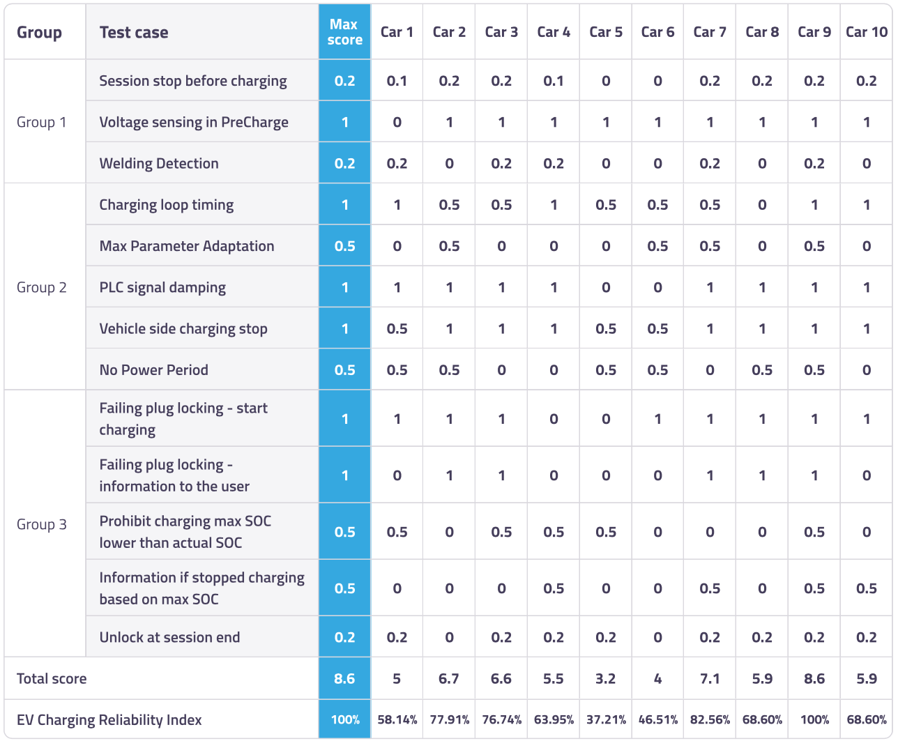 Within each category, several tests were conducted which are described in detail within the full report. For the initial report, a selection of 10 EU vehicles with CCS-connectors (each from one brand) with high adoption rates were tested. Unfortunately, the cars are anonymized but one can see the significant variance in the test results ranging from 37% up to 100% (see screenshot below for tests and results).