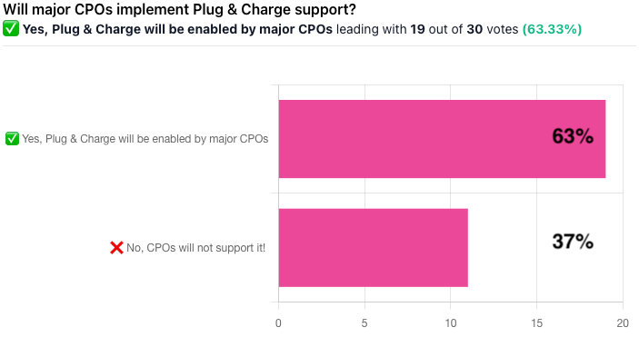 Last week, we asked y’all to vote if major CPOs will implement Plug & Charge support. Here are the results from 30 votes: 🤩