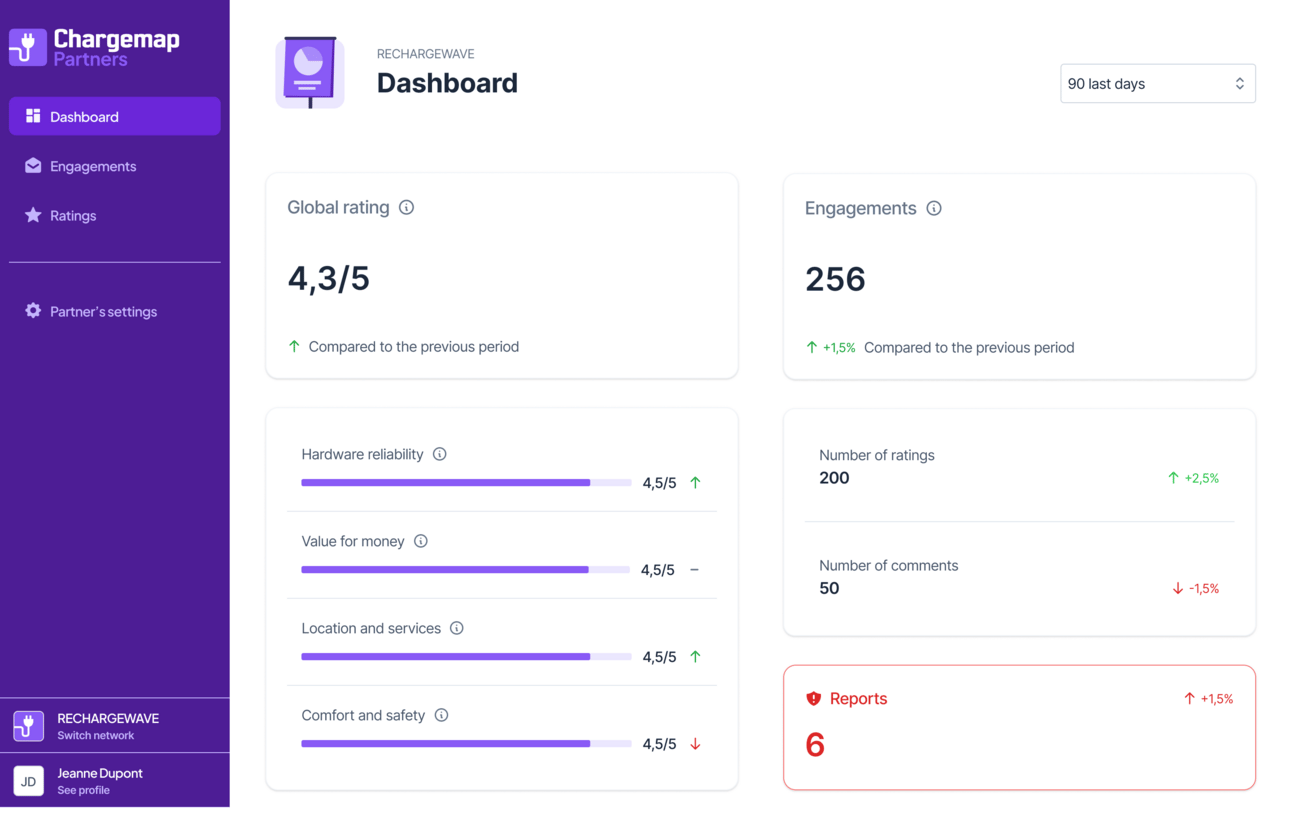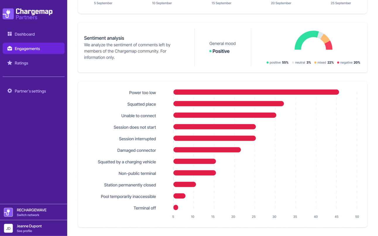 While this is helpful for the Chargemap community (more than 1.5 Mio. users), the generated insights are also extremely valuable for charge point operators (CPOs). In the newly created partners tool, CPOs can get insights down to a site level, interact with the community, and initiate maintenance based on review insights.