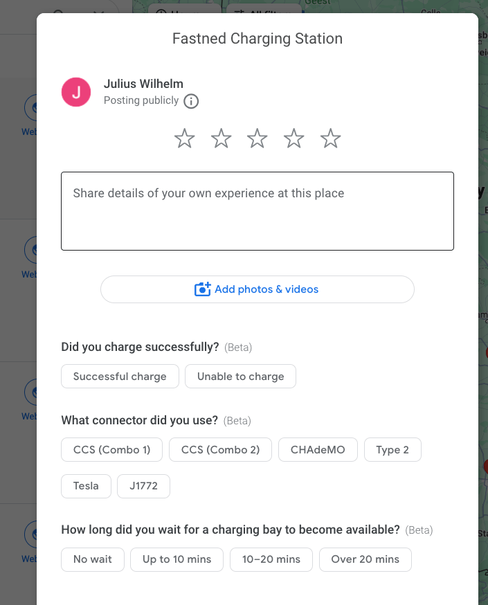 Along those lines, Google's beta for charging station reviews went live last week. Given the vast user base of Google and the familiar UI of this app, it's set to become a challenger to existing EV community apps like Chargemap or Plugshare. It remains to be seen whether EV communities with integrated MSP functionalities for charging can retain a competitive edge in data accuracy and up-to-dateness. Also, we are not sure if and how charging network operators can access this information for their purpose at this time. We are not aware of a Google Maps portal for CPOs (yet).